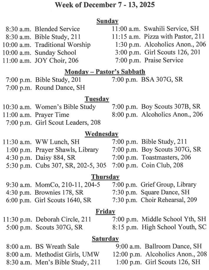 | 8:30 a.m. Contemporary Blended Worship in the Sanctuary. 10:00 a.m. Traditional Worship in the Sanctuary. 10:00 a.m. (or later) live-streamed “Worship at Home” video 7:00 p.m. Contemporary Praise service in the Sanctuary _____________________________________________________________ A detailed schedule for the coming week is: |