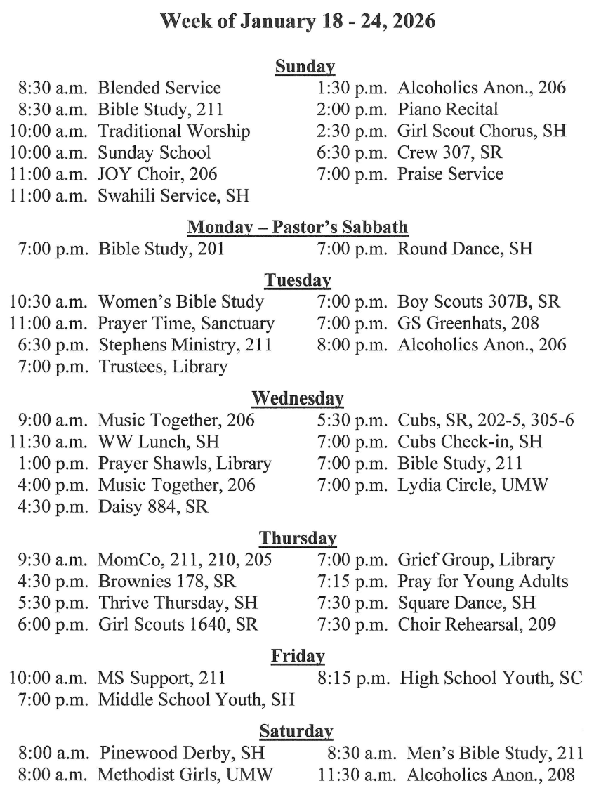 | 8:30 a.m. Contemporary Blended Worship in the Sanctuary. 10:00 a.m. Traditional Worship in the Sanctuary. 10:00 a.m. (or later) live-streamed “Worship at Home” video 7:00 p.m. Contemporary Praise service in the Sanctuary _____________________________________________________________ A detailed schedule for the coming week is: |